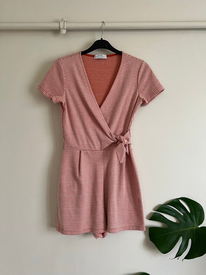 Kısa kollu, v yaka, kısa tulum. Pastel kırmızı ekose deseni ve belde kuşak detaylarıyla hiç kullanılmamıştır.