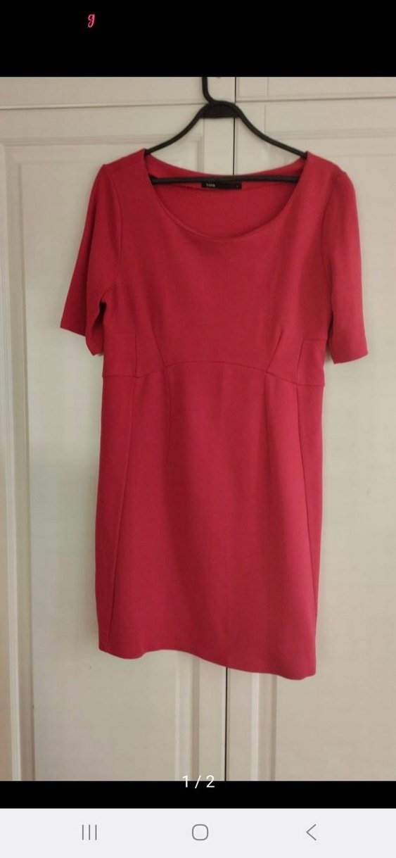 Kırmızı, kısa kollu, midi boy elbise. Dar kesim, yuvarlak yaka ve parlak dokusu ile ofis ortamına uygun minimal bir tasarıma sahiptir.