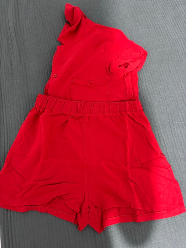 Canlı kırmızı renkte, kısa kollu ve gömlek tasarımlı, düğmeli ve kısa boy takım.