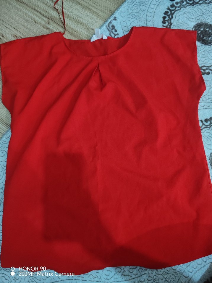 Kırmızı, kısa kollu, keten kumaştan salaş kesim bluz. Yuvarlak yakalı, drapeli ve parlak görünümlü, günlük sokak stiline uygun.