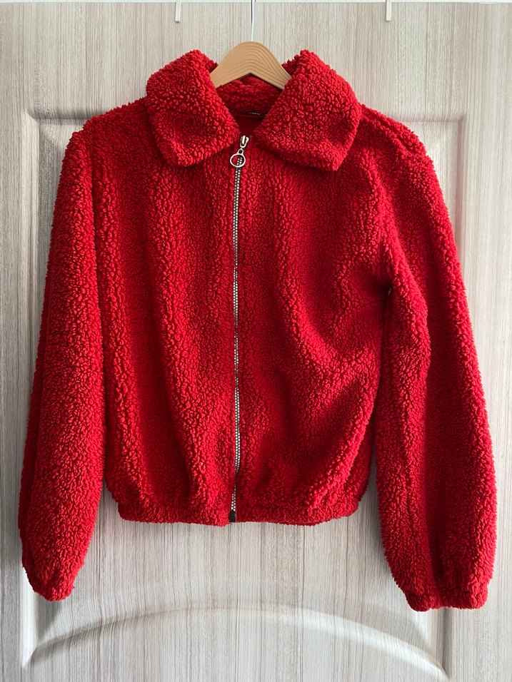 Kırmızı, kısa boylu, uzun kollu ve yüksek yakalı kadın ceketi. Yumuşak ve sıcak kumaştan, kürk detaylıdır. Günlük kullanıma uygun sade ve renkli bir tasarıma sahiptir.
