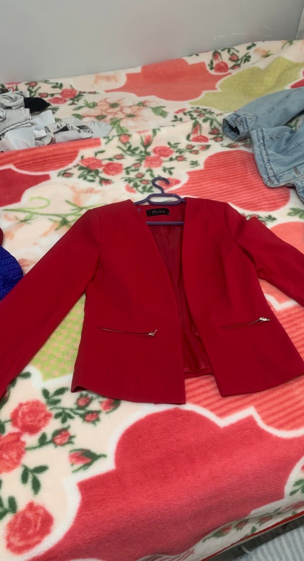 Kırmızı renkli, kısa mini kesim kadın blazer. Notlu yaka ve uzun kollu, fermuarlı ceplerle sentetik kumaştan, ofis ve günlük rahat kullanıma uygun.