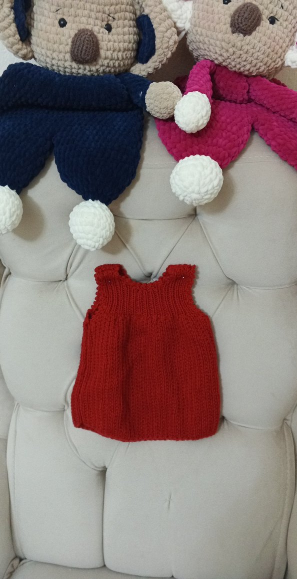 Kırmızı, kısa boylu, örgü bebek süveter, yuvarlak yaka ve kolsuz tasarıma sahiptir. Rahat ve basic tarzda, günlük kullanıma uygundur.