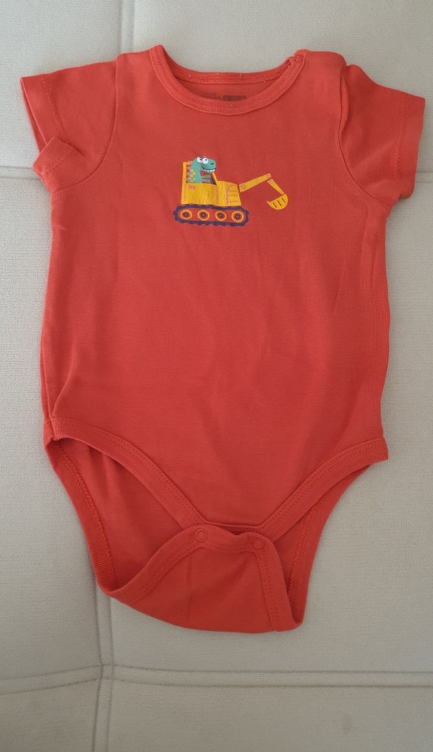 Kırmızı kolsuz kız bebek body, renkli ekskavatör baskısı ve kolay giydirme için düğmeli tasarıma sahiptir.