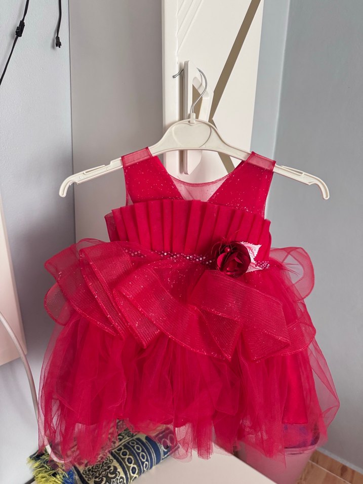 Fırfırlı ve çiçek detaylı kırmızı, straplez kız çocuk elbisesi. Yumuşak sentetik kumaştan yapılmış, renkli ve çağdaş tasarım.