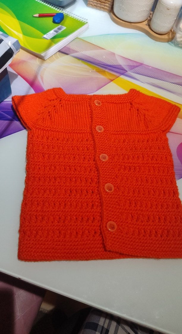 Kız çocukları için kısa kollu, fitted kesim, yumuşak örgü kumaştan yapılmış canlı kırmızı renkli hırka. Düğmeli ön ve desensiz sade tasarım.