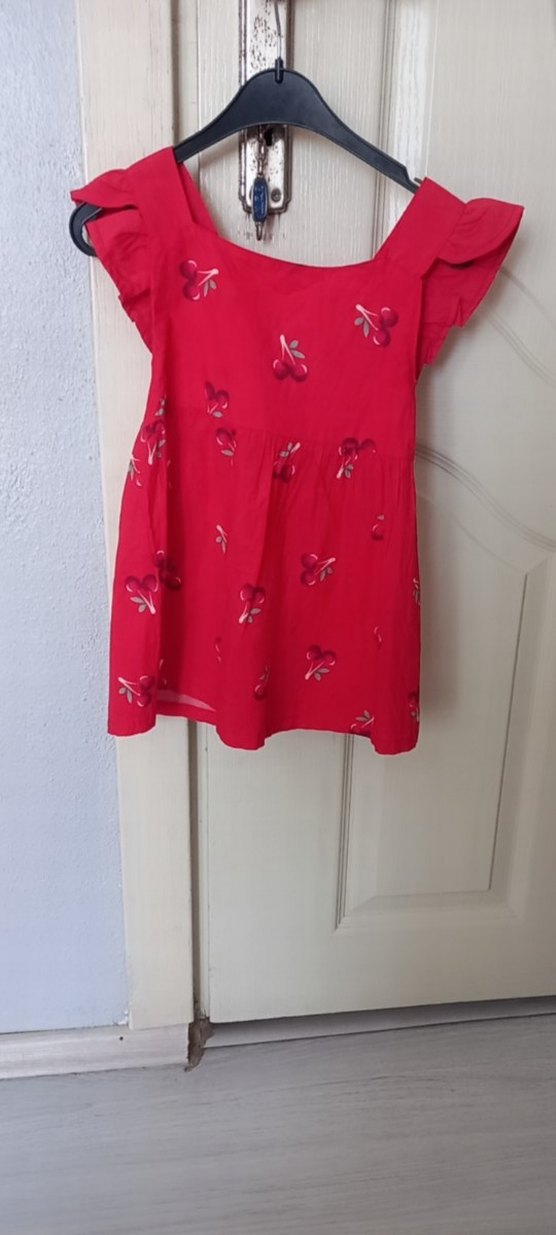 Kısa kollu ve fırfırlı detaylı, omuzdan askılı kız çocuk elbisesi. Sentetik kumaştan, bol kesim ve renkli batik desenlidir. Bohem tarzda.