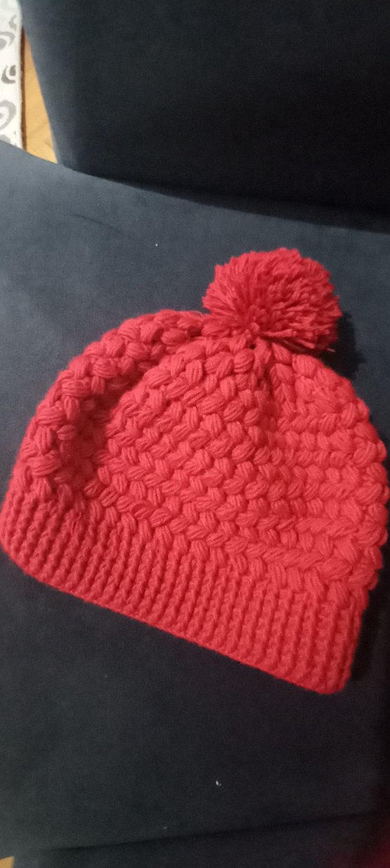 Kırmızı örgü pamuklu ipten yapılmış, üstünde ponpon bulunan sıcak tutan kız çocuk bere.