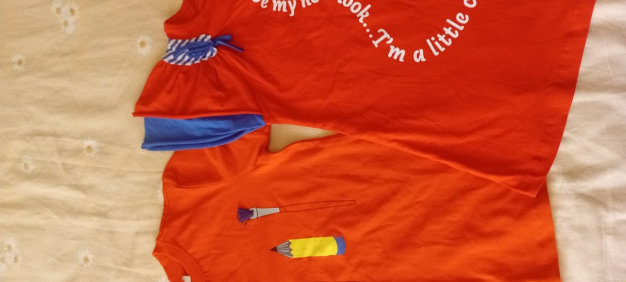 Turuncu zemin üzerine kalem ve fırça baskılı, renkli çocuk tişörtü.