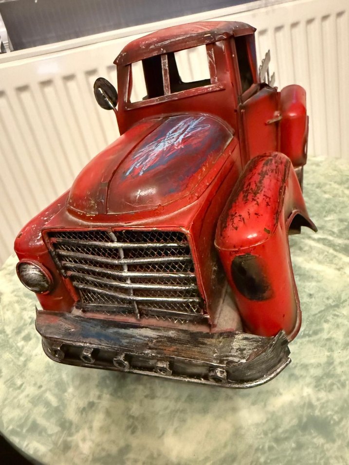 Kırmızı metalden yapılmış, vintage tasarımlı oyuncak araba. Detaylı ızgara ve yan aynalara sahip, renkli ve aşınmış görünümlü.