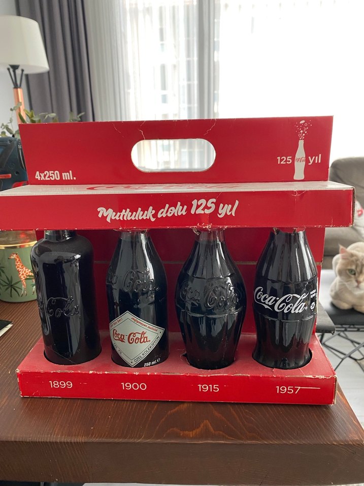 1899'dan 1957'ye kadar farklı yıllara ait kırmızı Coca-Cola şişelerinden oluşan 4'lü set. Her şişe 250 ml kapasitelidir.