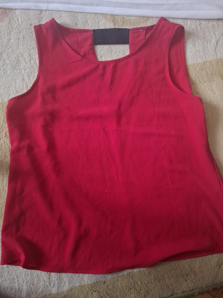 Kırmızı, kolsuz, yuvarlak yakalı, bol kesim kadın atlet. Parlak görünümlü sentetik kumaştan, günlük sokak tarzı için uygun midi boyda.