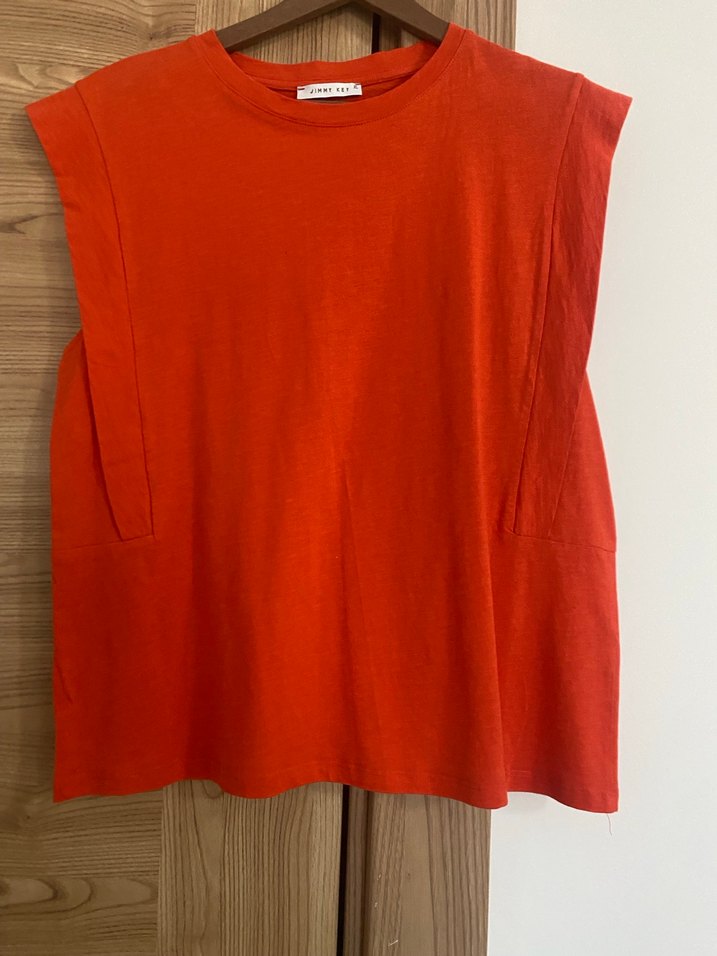 Hiç giyilmedi sıfır ürün. Kırmızı kolsuz keten bluz, yuvarlak yaka ve bol kesimiyle gündelik kullanıma uygun, minimalist bir tarz sunar.