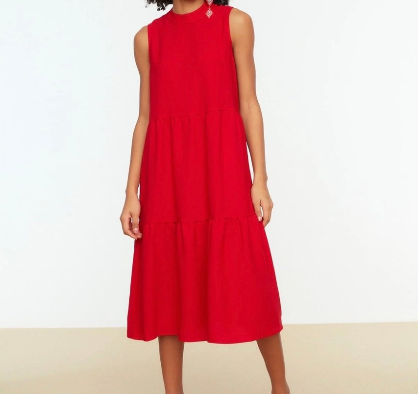 Kolsuz, kırmızı midi elbise, yüksek yakalı ve bol kesimdir. Nefes alabilen keten kumaştan yapılmıştır. Sade, desensiz tasarımı bohem ve minimal bir stil sunar, romantik akşamlar için uygundur. ❤️