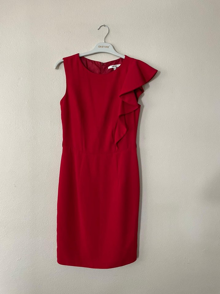 Kolsuz kırmızı midi elbise, v yaka ve omuzda fırfır detayıyla. Modern klasik ve minimalist tarzda, ofis kullanımı için uygun.