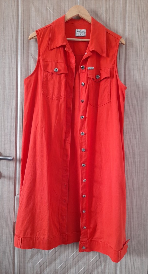 Kolsuz, kırmızı midi elbise, çıtçıtlı ön ve kesimli yaka detayına sahiptir. Keten kumaştan, bol kesim ve günlük rahat sokak stili için idealdir.✨