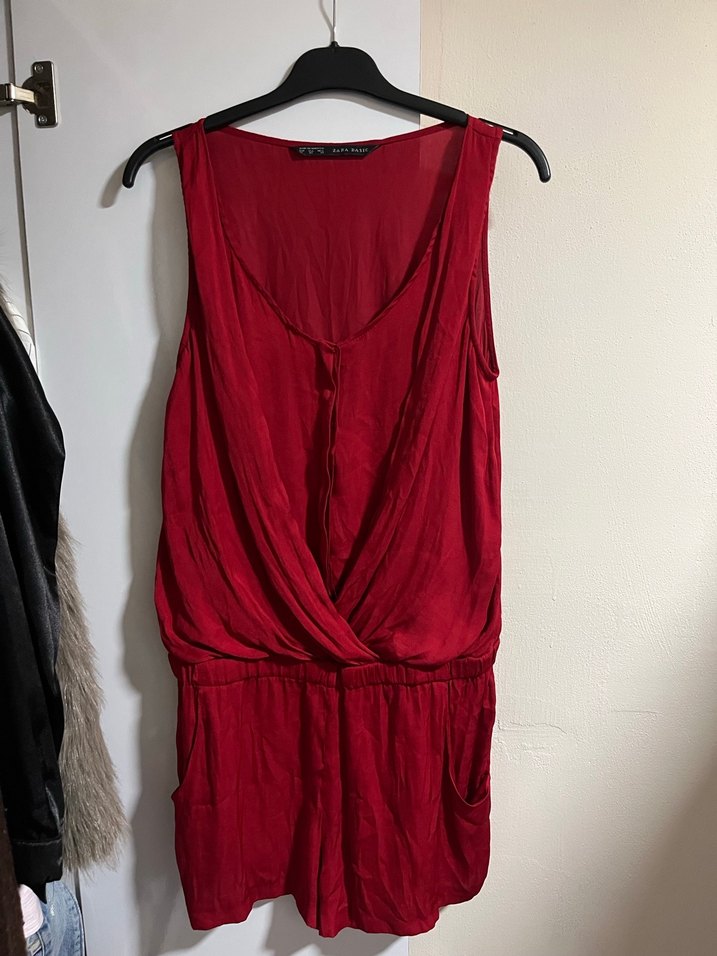 Kolsuz kırmızı tulum, drapeli V yaka ve bol kesimlidir. Midi boyda, romantik akşamlar için uygun bohem ve minimalist tarzda.