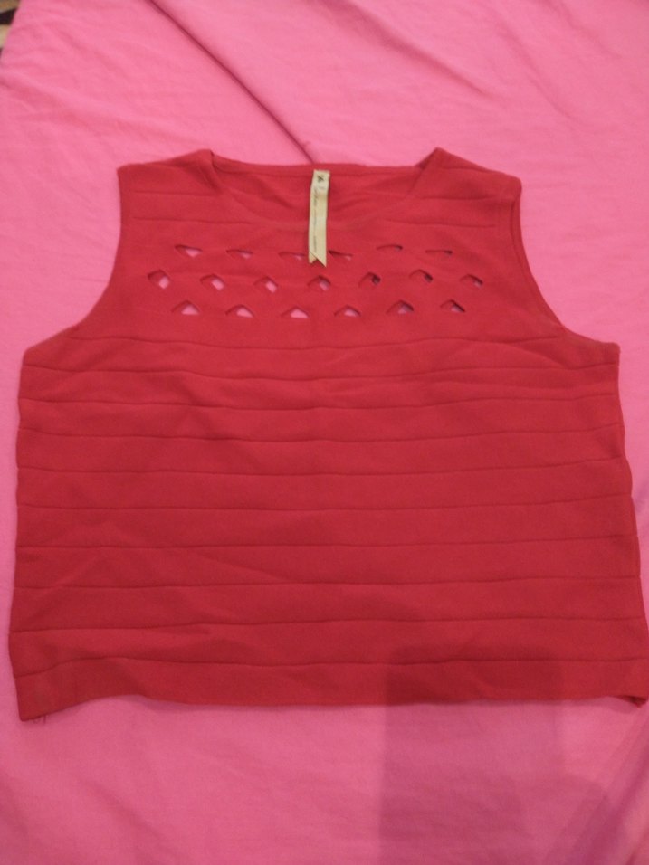 Kırmızı, kolsuz ve vücuda oturan mini atlet, yuvarlak yaka ve önünde kesik detaylarıyla sokak stiline uygun.