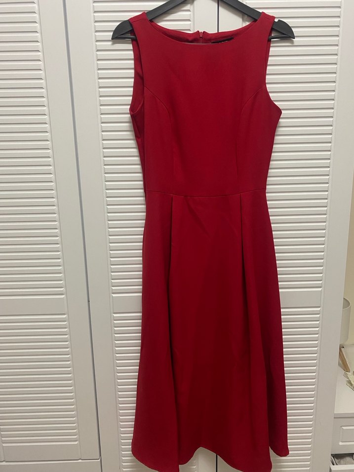 Kırmızı uzun kolsuz abiye elbise, pileli detaylara sahip, ofis için uygun modern klasik tasarım.
