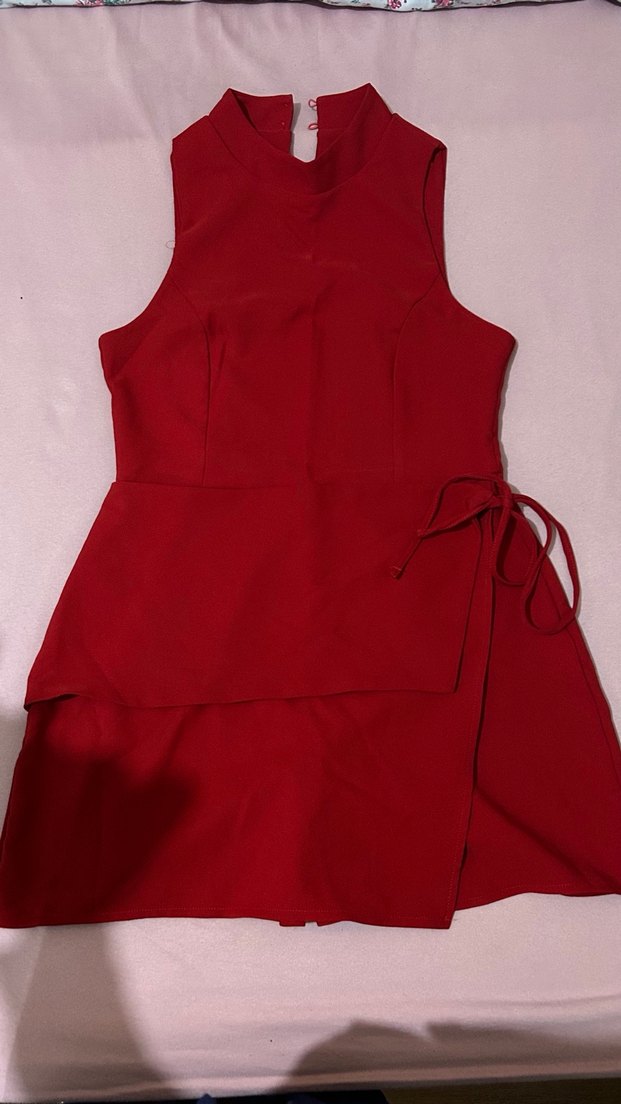 Koyu kırmızı renkte, kolsuz, yüksek yakalı ve vücuda oturan kesime sahip kadın tulumu. Asimetrik drapeli ve midi boyda, sentetik kumaştan üretilmiştir. Şort etek duruşuyla aşırı kıllanıslı
