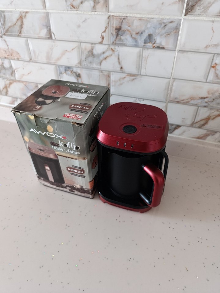 Koyu kırmızı renkte, kullanımı kolay düğmeler ve sağlam kulplu kompakt kahve makinesi. ☕