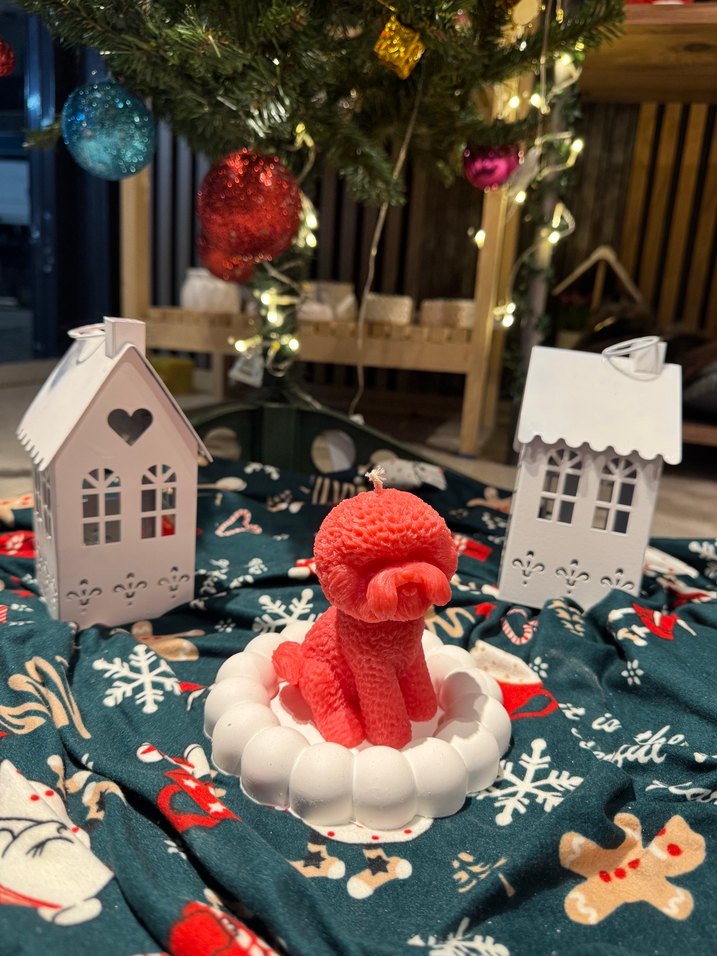 Beyaz boncuklu taban üzerinde duran renkli kırmızı köpek figürlü mum. Festif dekorasyon için uygun. ️