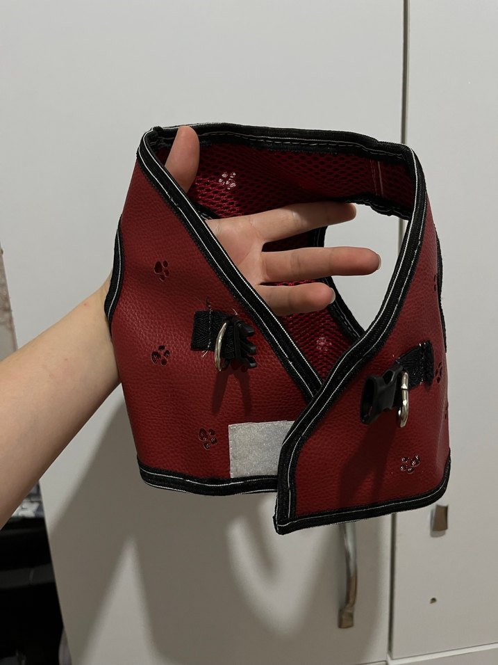 Ayarlanabilir kayışlı, pati desenli kırmızı köpek göğüs tasması, rahat ve güvenli kullanım sağlar.