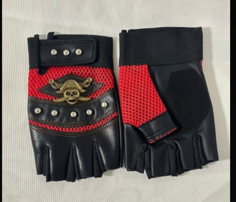 Koyu kırmızı korsan desenli, metal perçinli ve kafatası figürlü biker eldivenler, grunge punk tarzını yansıtıyor.