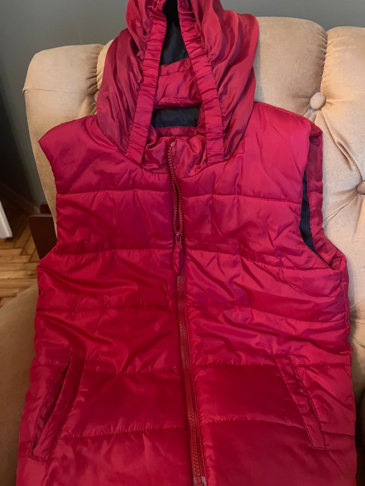 Katlanabilir kapüşonlu. Kırmızı. Defosuz. Kız çocuk da erkek çocuk da kullanabilir. Yelek.