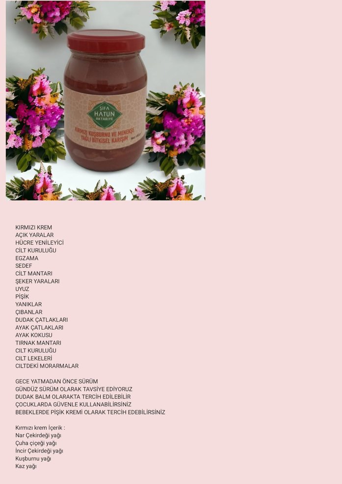 Egzama, yaralar, cilt kuruluğu, mantar gibi birçok cilt sorunu için uygun kırmızı krem. Dudak balmı olarak da kullanılabilir, gece yatmadan önce sürülmesi tavsiye edilir.