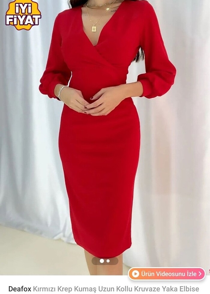 Kırmızı Krep kumaş uzun kollu kruvaze yaka elbise