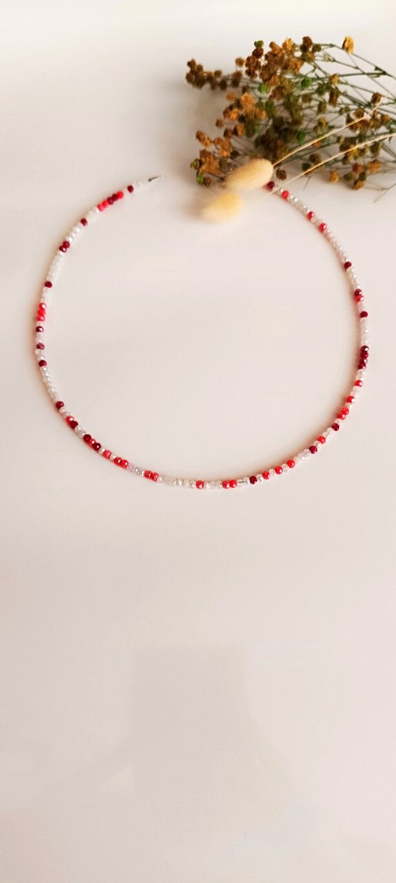 Lütfen Almadan önce Yeni bir ilan açtırınız Çelik tel üzerine dizili Bu bohem tarz kolye, açık kırmızı ve beyaz Kristal boncuklardan oluşan batik desen sunar, romantik akşamlar için minimal ve retro bir görünüm sağlar.