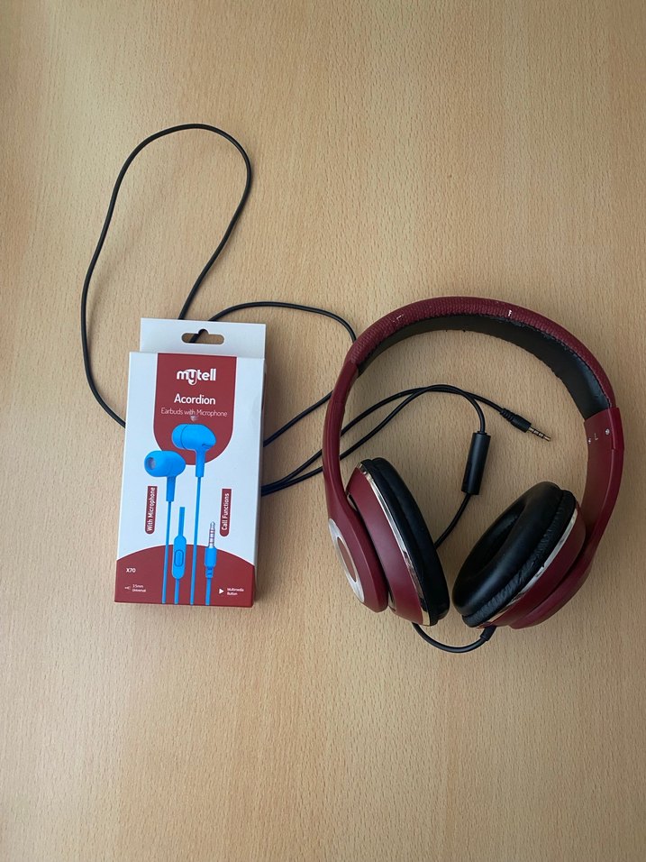 Mytell markalı kırmızı renkli büyük kulaklık ve renkli mavi küçük kulaklık kablolu olarak sunulmaktadır.