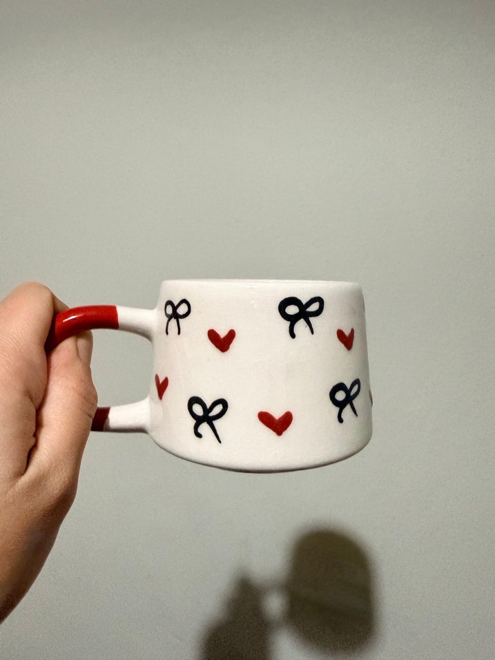 Kırmızı kalpler ve siyah fiyonk desenleriyle beyaz kupa, kırmızı kulplu. Sıcak içecekler için uygun. ☕