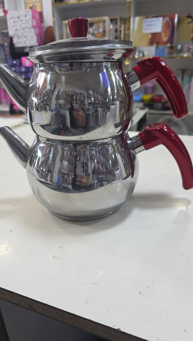 Paslanmaz çelikten yapılmış, kırmızı kulplu renkli çaydanlık seti. Üst üste iki parçadan oluşur, çay demlemek ve servis yapmak için uygundur.