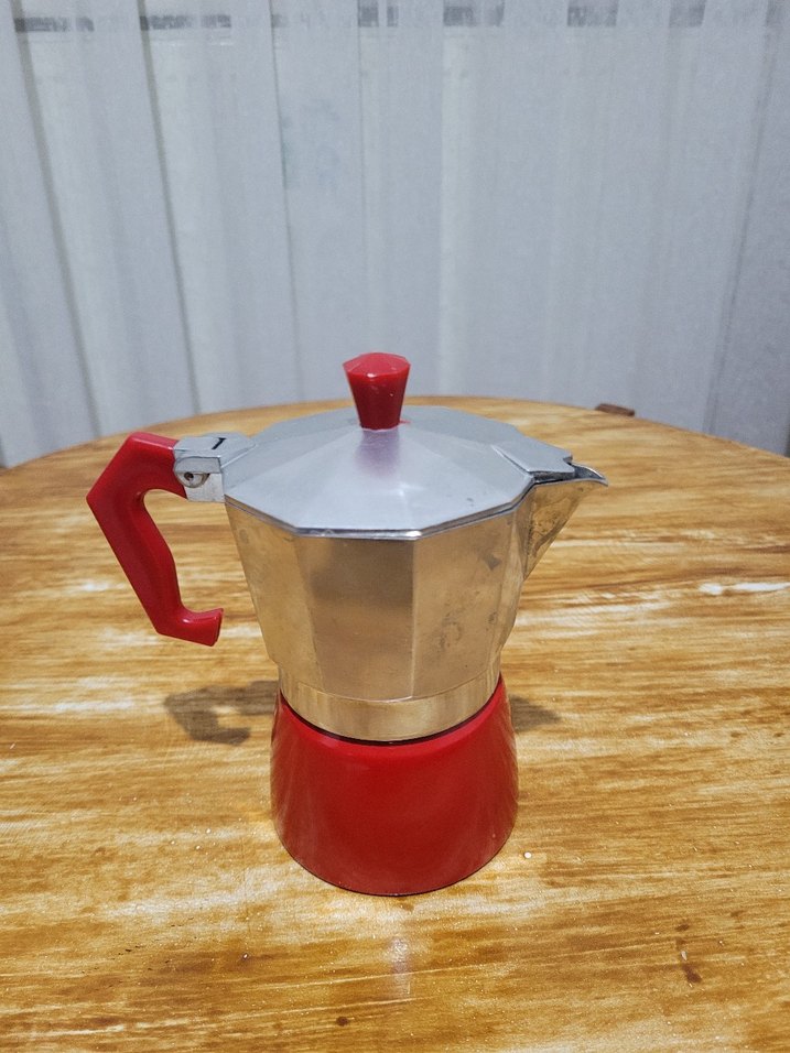 Kırmızı kulplu ve tabanlı, gümüş üst gövdesi olan, ocakta kahve demlemek için kullanılan moka pot. ☕