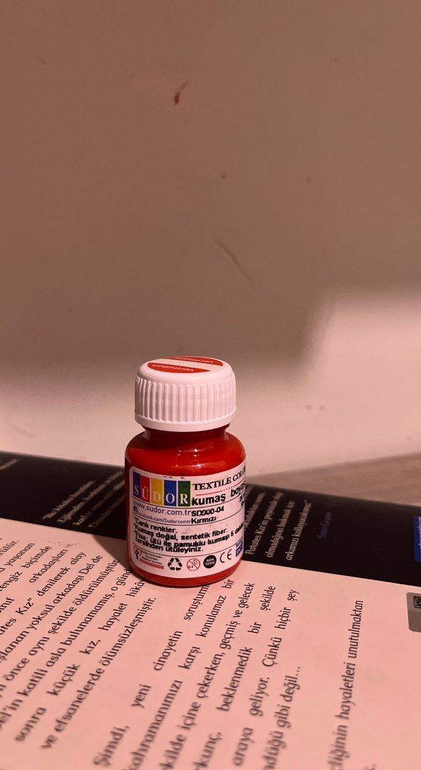 Rkumas kırmızı kumaş boyası şişesi, canlı renklerle tekstil boyama ve çizim için uygundur. Detaylı kumaş çalışmaları için idealdir. Hiç kullanılmamıştır