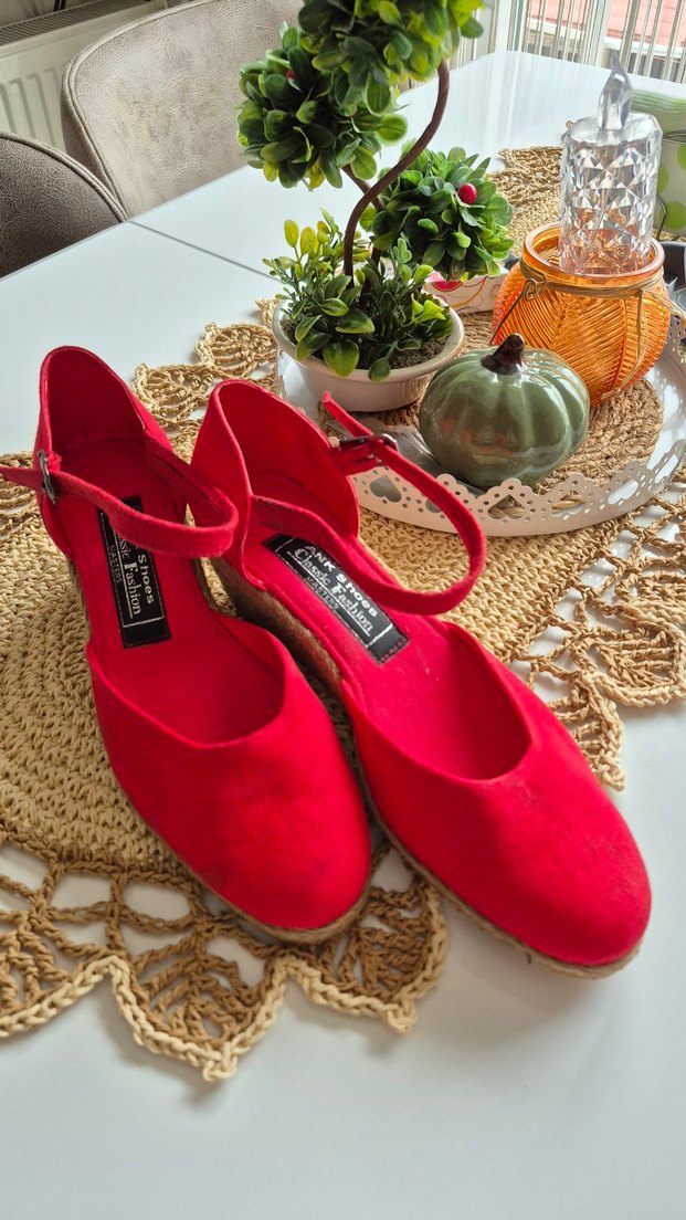 Kırmızı kumaş malzemeden dolgu topuklu espadriller, bohem tarzıyla romantik akşamlar için ideal. Canlı renkleriyle zahmetsiz şıklık sunar. ❤️