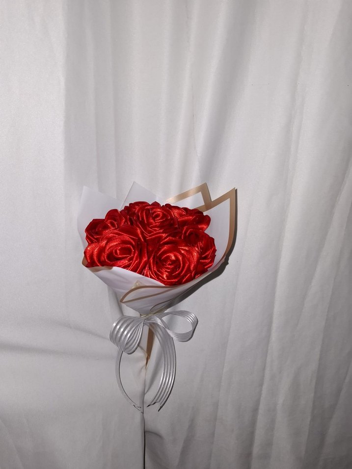 Beyaz buket kağıdına sarılmış kırmızı kurdele çiçek buketi. Sevdikleriniz için solmayacak bir buket. Sipariş alınır.