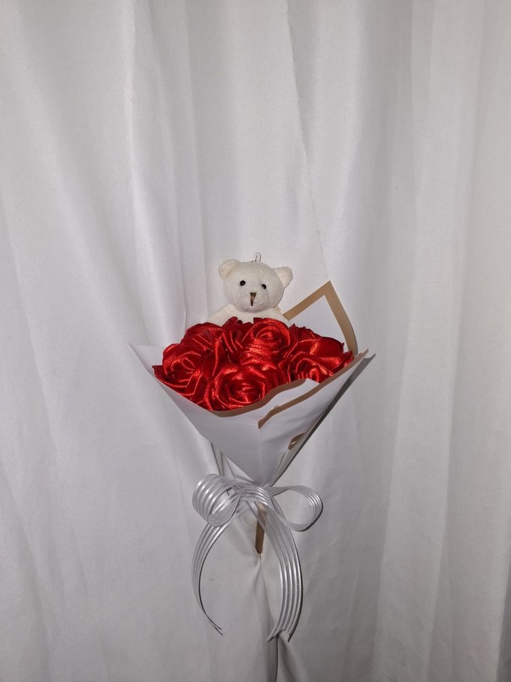 Beyaz buket kağıdına sarılmış ayıcıklı, kırmızı kurdele çiçek buketi. Sevdikleriniz için solmayacak bir buket. Sipariş alınır.