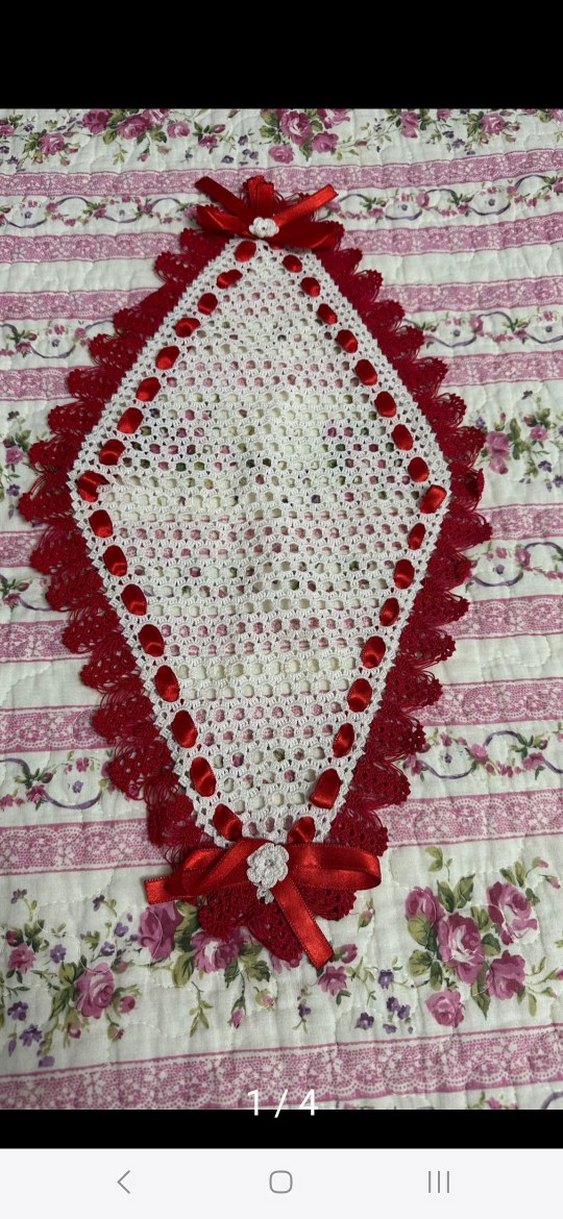 Kırmızı kurdele ve süslemeli fiyonk detayına sahip, beyaz ve kırmızı renklerde el örgüsü dantel.