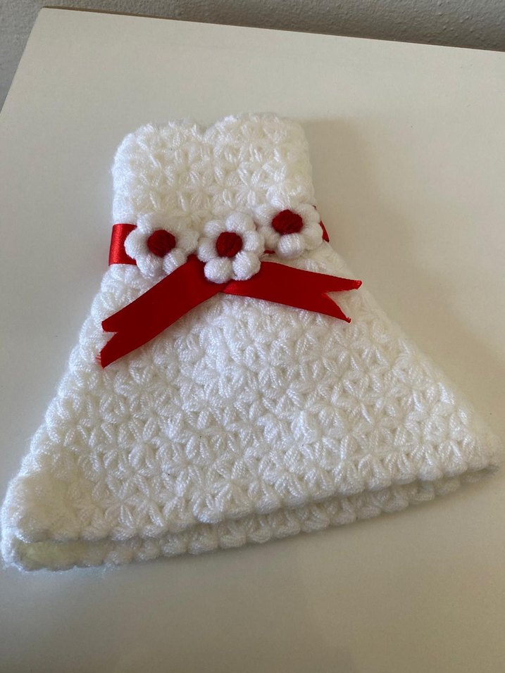 Kırmızı Kurdeleli Beyaz Örgü Mini Gelinlik