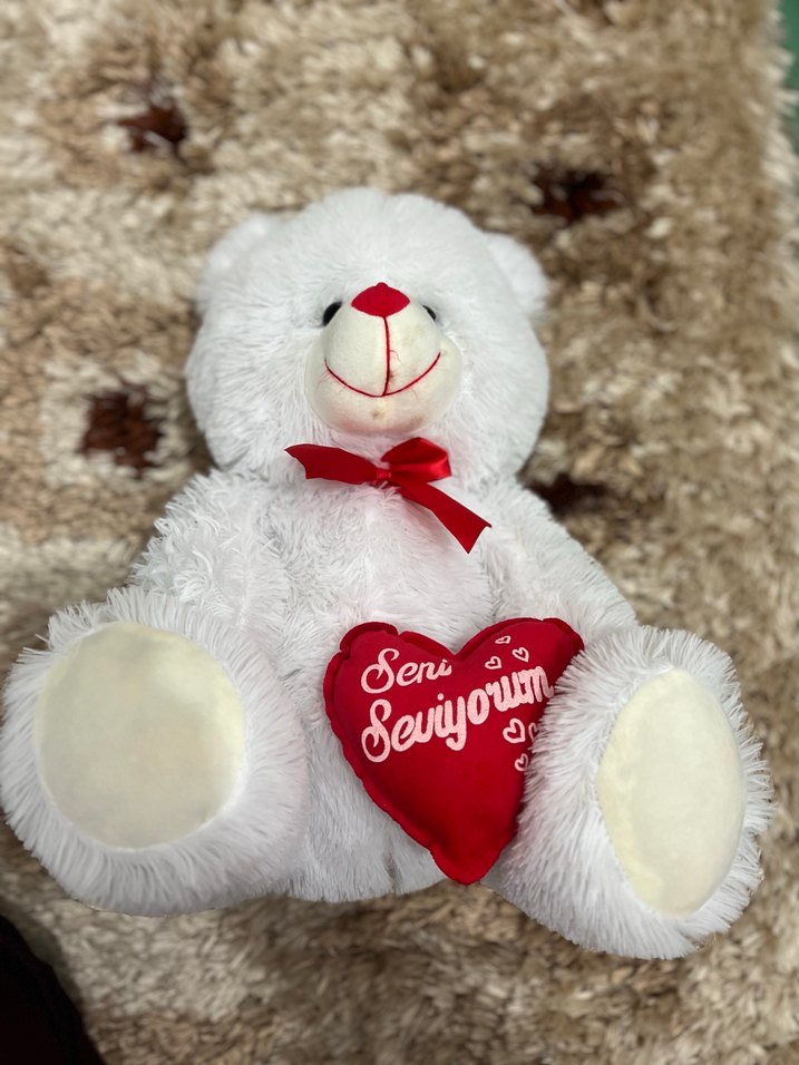 Kırmızı kurdeleli beyaz peluş ayı, üzerinde "Seni Seviyorum" yazan kırmızı kalp ile. Yumuşak ve renkli detaylara sahip.
