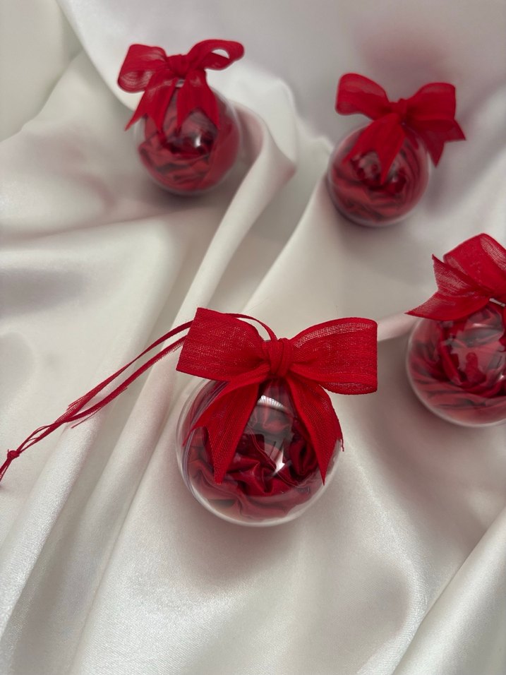 İçinde saten toka bulunan şeffaf Mika küreler sizlere özel olarak istediğiniz renklerde hazırlanmaktadır.