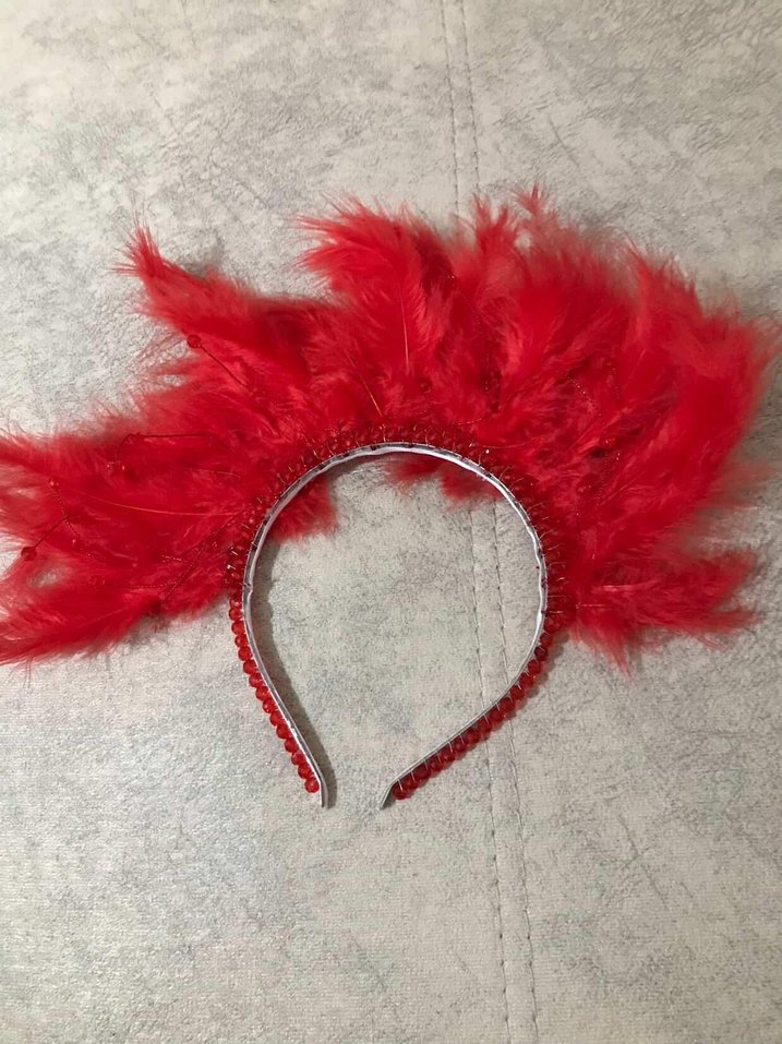 Canlı kırmızı sentetik kürklü tüy detaylı saç tacı, avant-garde ve karşı kültür tarzını yansıtıyor. Moda öncülerine uygun.