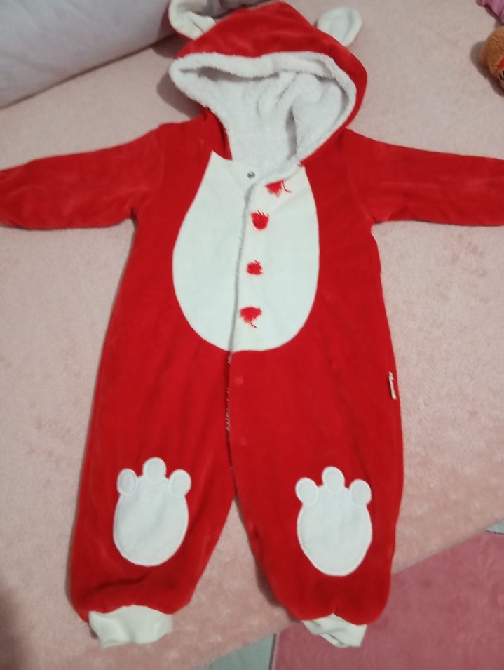 Kırmızı renkli, yumuşak ve sıcak kumaştan yapılmış, kürk detaylı, desenli ve renkli bebek kayak tulumu. ❄️
