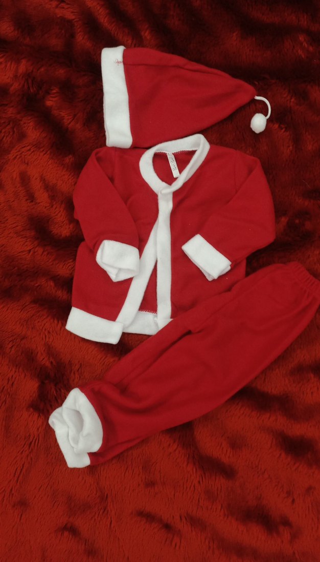 Kırmızı, uzun kollu ve kürk detaylı çocuk kostümü. Notch yaka ceket, uyumlu pantolon ve şapka içerir.