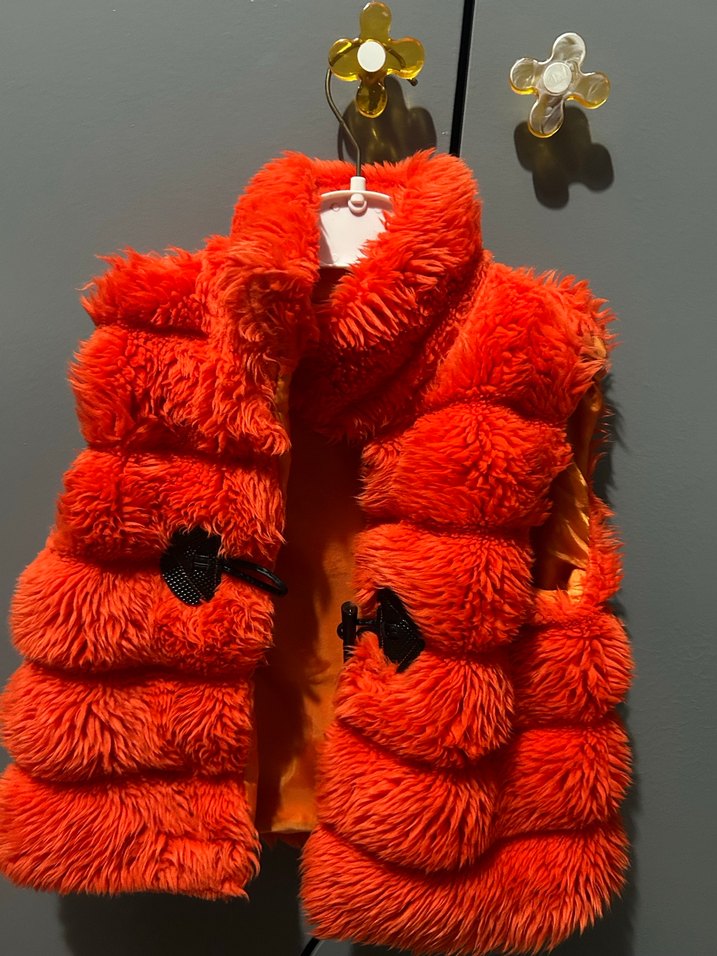Canlı kırmızı renkte, kürklü detaylı, yüksek yakalı ve vücuda oturan kesime sahip, yumuşak ve sıcak dokulu kolsuz yelek. Günlük sokak stili için uygun.