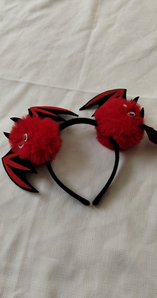 Kırmızı kürklü top ve nakışlı yarasa kanatlarıyla gotik tarzda çocuk taç. Rock punk havası katan renkli detaylar içerir.