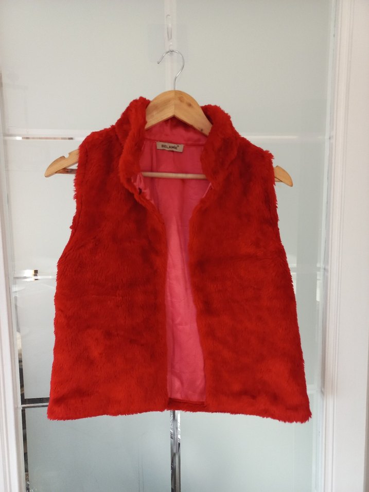 Canlı kırmızı renkte, yüksek yakalı, kürklü ve vücuda oturan kolsuz yelek. Rahat ve şık günlük kullanım için uygundur. en 46cm boyu 52cm